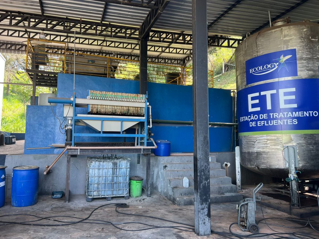 Diariamente, a ECOLOGY recebe de seus clientes materiais contaminados com óleos, graxas, tintas e etc. Durante o processo de lavagem destes materiais as máquinas de lavar e centrifugas liberam água contaminada, esta água é direcionada para uma estação de tratamento de efluentes (E.T.E) onde recebe um tratamento físico-químico primário. Depois de tratada, a água é reutilizada no processo de lavagem novamente. Os resíduos gerados durante o processo de tratamento da água são chamados de lodo industrial e borra pastosa. Estes são destinados para nosso parceiro Alternativa Ambiental que realiza o co-processamento desses resíduos. Todo o processo de acondicionamento, transporte e tratamento são devidamente regularizados conforme requisitos do órgão ambiental CETESB.